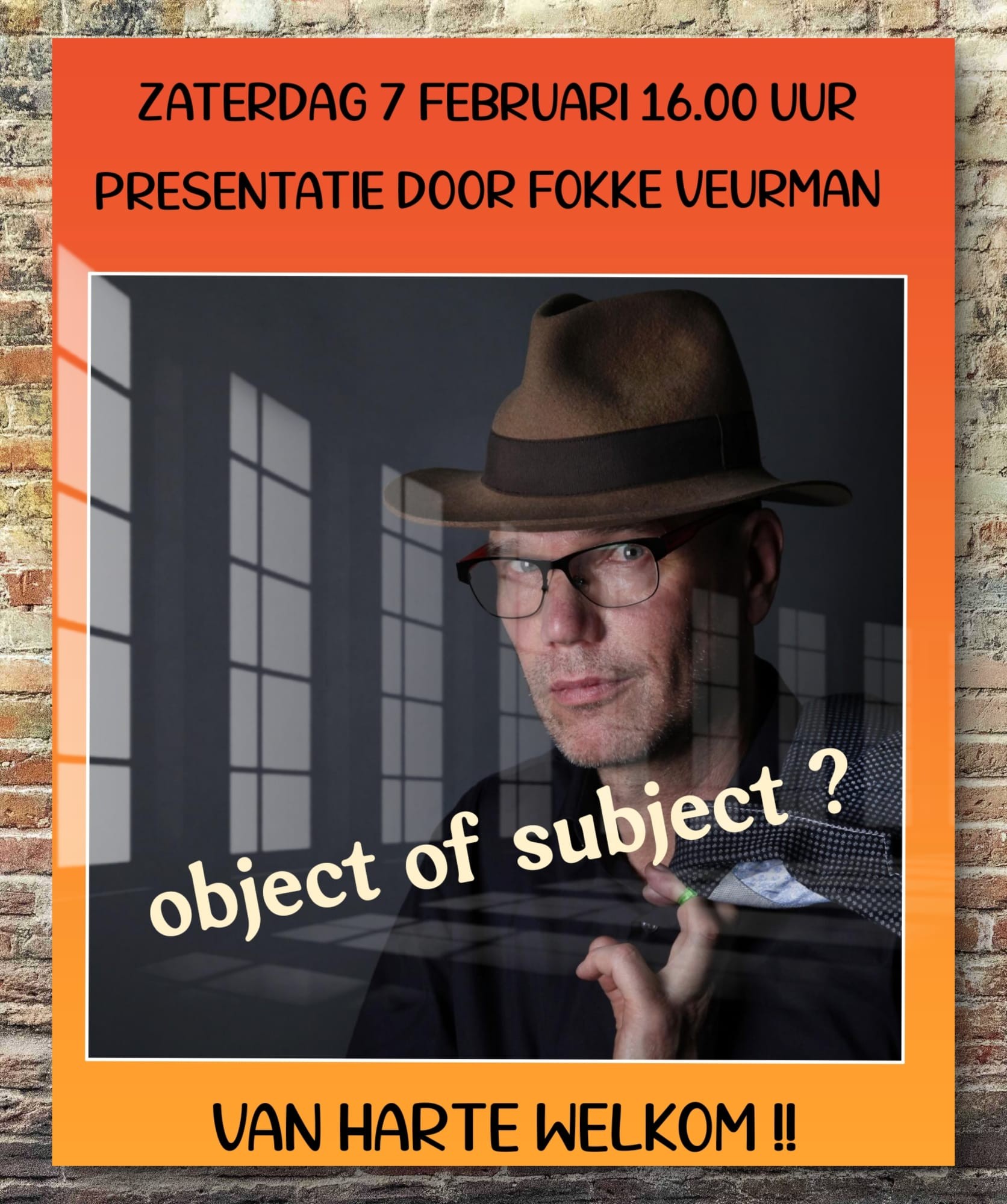Om 16.00 geeft Fokke Veurman een presentatie van zijn werk object of subject ?